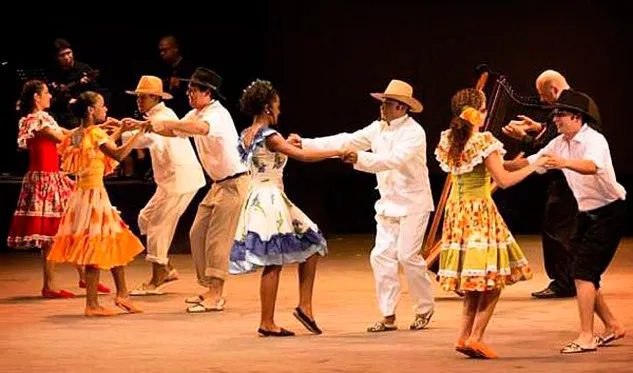 El joropo integra instrumentos como arpa, cuatro, maracas, bandola y violín, mientras los bailarines zapatean con fuerza al ritmo de la música. Las mujeres usan faldas largas y coloridas; los hombres, vestimenta blanca y sombrero de ala ancha.