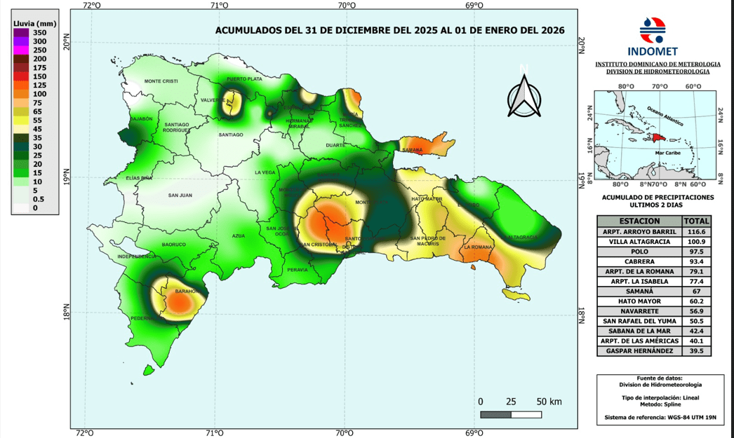 RDE DIGITAL, SANTO DOMINGO.-El Instituto Dominicano de Meteorología (Indomet) informó que entre el 31 de diciembre de 2025 y el 1 de enero de 2026 se registraron acumulados significativos de lluvias en varias zonas del país, con un máximo de 116.6 milímetros en el aeropuerto Arroyo Barril, Samaná.
